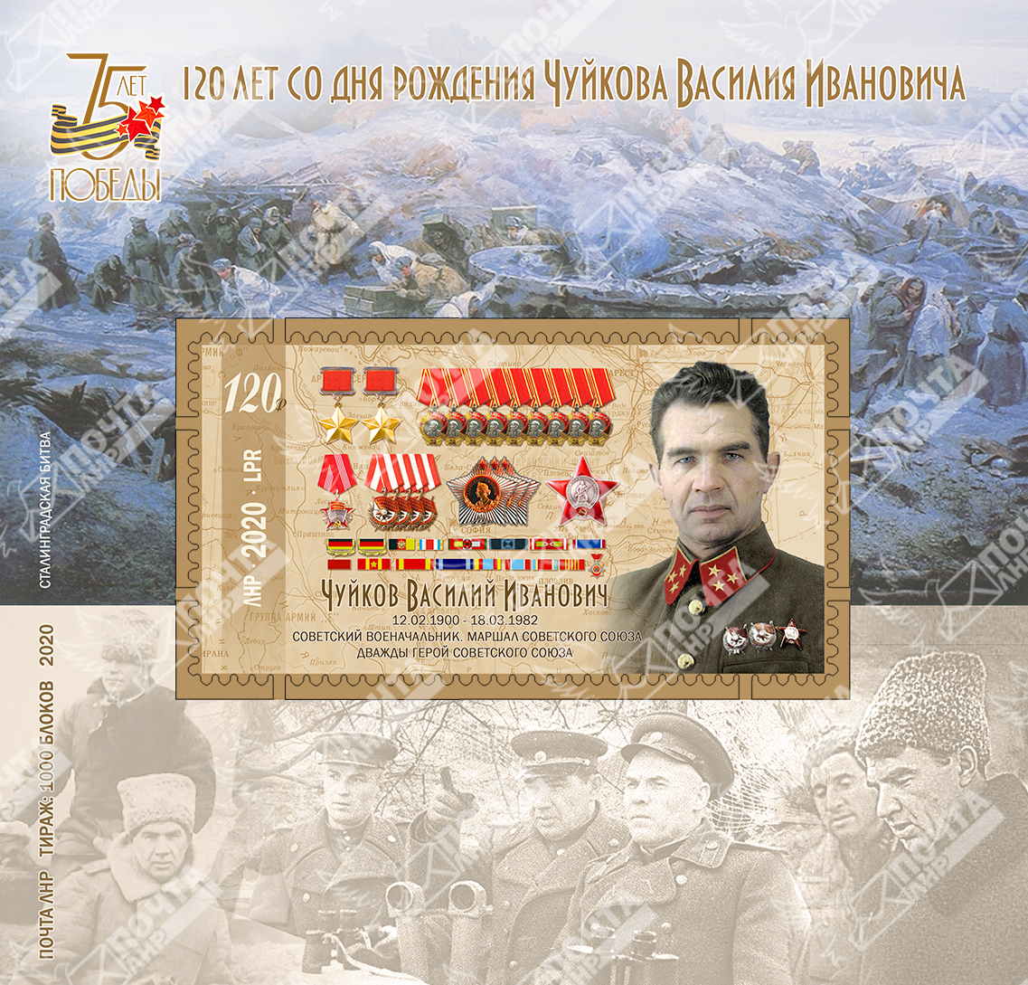 12.02.2020 года вводится в обращение и считается действительным для оплаты услуг почтовой связи во всех почтовых отделениях блок художественных почтовых марок (далее «БХПМ») из серии «75 ЛЕТ ПОБЕДЫ В ВЕЛИКОЙ ОТЕЧЕСТВЕННОЙ ВОЙНЕ» - «120 ЛЕТ СО ДНЯ РОЖДЕНИЯ ЧУЙКОВА В.И.».
